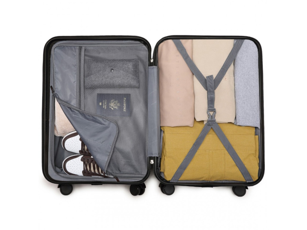 - Pružné křížové popruhy pro upevnění obsahu na jedné straně a zipem zavíraná přihrádka na druhé straně kufru