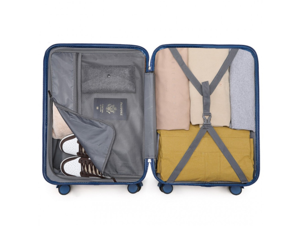 - Pružné křížové popruhy pro upevnění obsahu na jedné straně a zipem zavíraná přihrádka na druhé straně kufru
