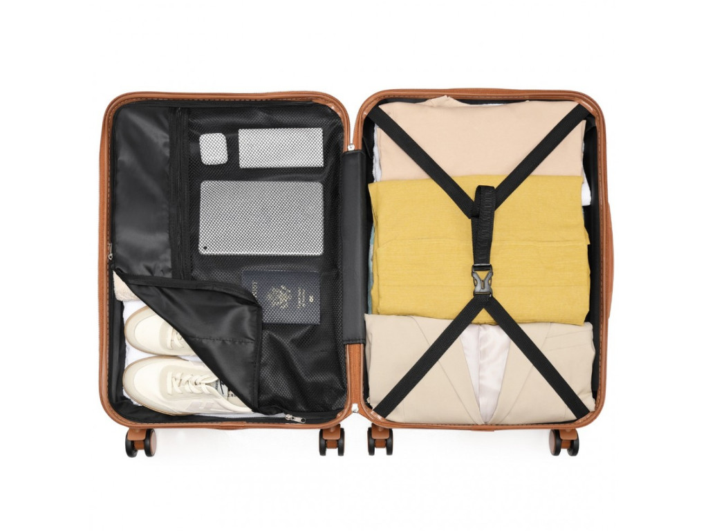- Pružné křížové popruhy pro upevnění obsahu na jedné straně a zipem zavíraná přihrádka na druhé straně kufru