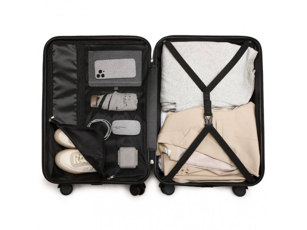 - Pružné křížové popruhy pro upevnění obsahu na jedné straně a zipem zavíraná přihrádka na druhé straně kufru