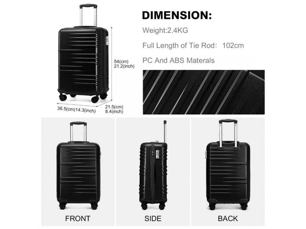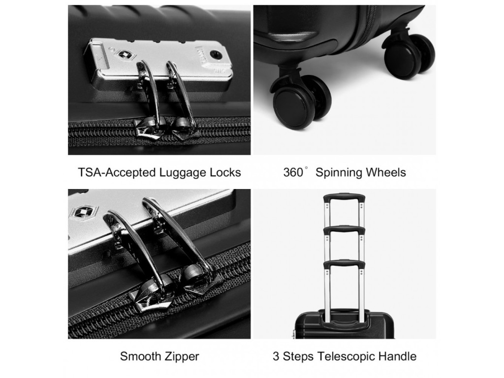 Kufry jsou vyrobeny z materiálu ABS s hliníkovou výsuvnou rukojetí a TSA číselným zámkem. ABS materiál je pevný, nabízí odolnost proti poškrábání a je vhodný do nízkých teplot. Tento materiál není tolik pružný jako polypropylen ale pro nenáročné cesty je plně dostačující.