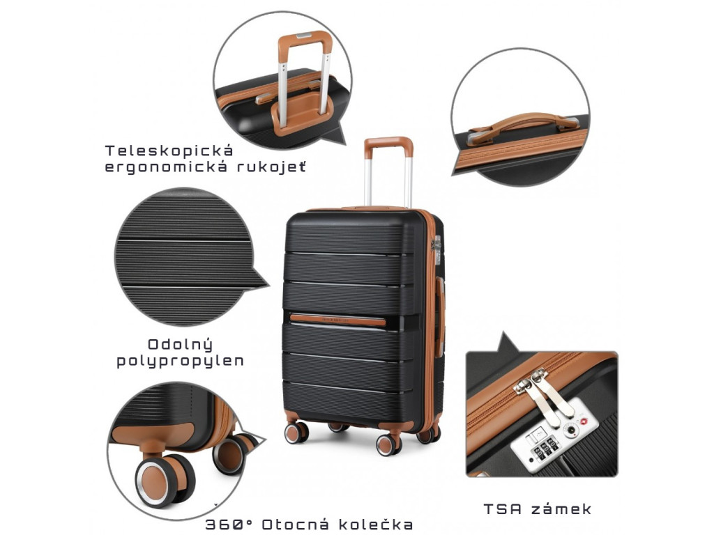 Kufr je vyroben z kvalitního polypropylenu s tichými dvojitými kolečky, hliníkovou výsuvnou rukojetí, TSA číselným zámkem a kvalitními zipy. Madlo kufru na horní i boční straně.