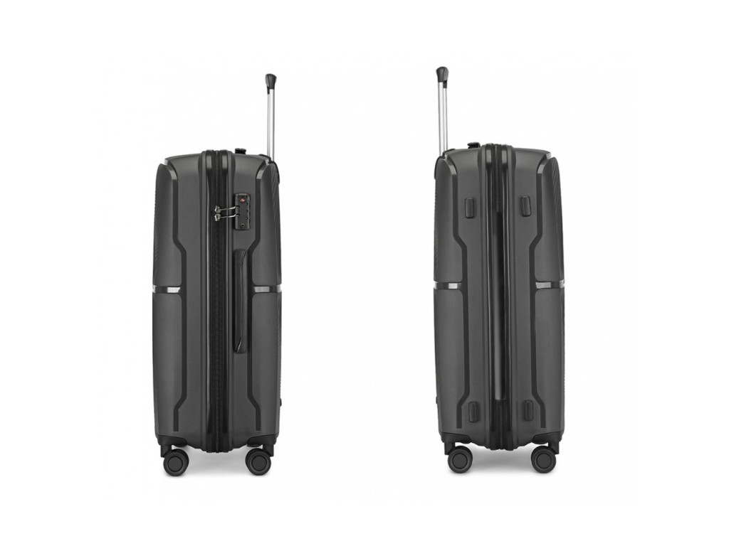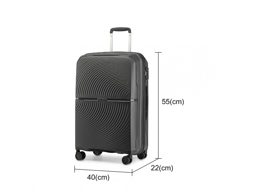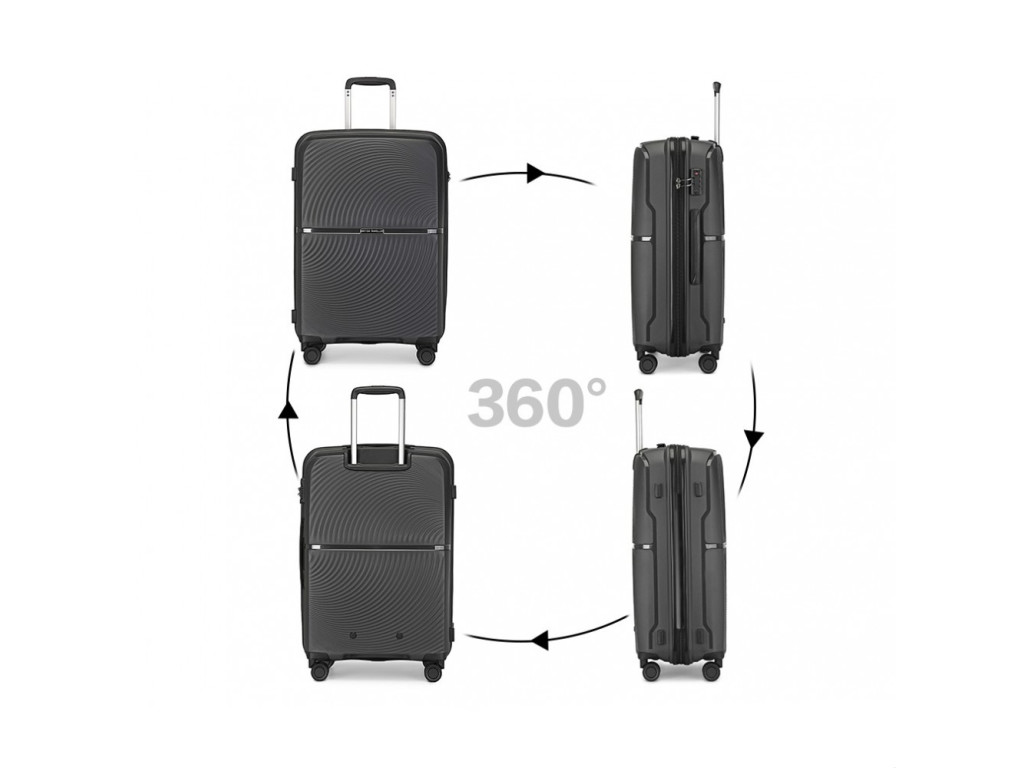 Kufr je vyroben z kvalitního polypropylenu s tichými dvojitými kolečky, hliníkovou výsuvnou rukojetí, TSA číselným zámkem a kvalitními zipy. Madlo kufru na horní i boční straně. Zejména u kabinového kufru většina výrobců madlo na podélné straně nenabízí.