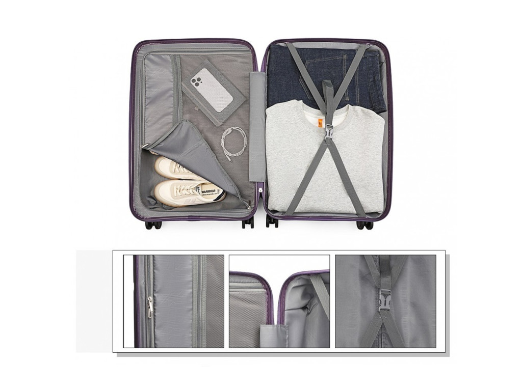 - Nylonové křížové popruhy pro upevnění obsahu na jedné straně. Zipem zavíraná přihrádka na druhé straně kufru včetně dvou síťovaných kapes pro lepší organizaci v kufru.