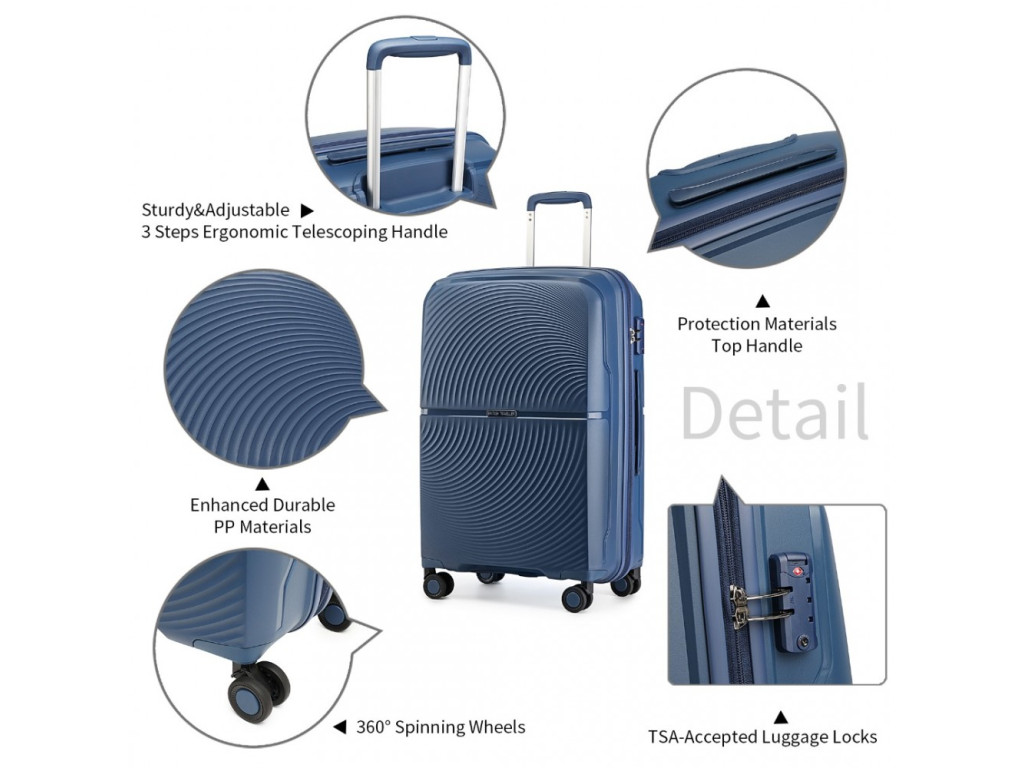 Kufr je vyroben z kvalitního polypropylenu s tichými dvojitými kolečky, hliníkovou výsuvnou rukojetí, TSA číselným zámkem a kvalitními zipy. Madlo kufru na horní i boční straně. Zejména u kabinového kufru většina výrobců madlo na podélné straně nenabízí.