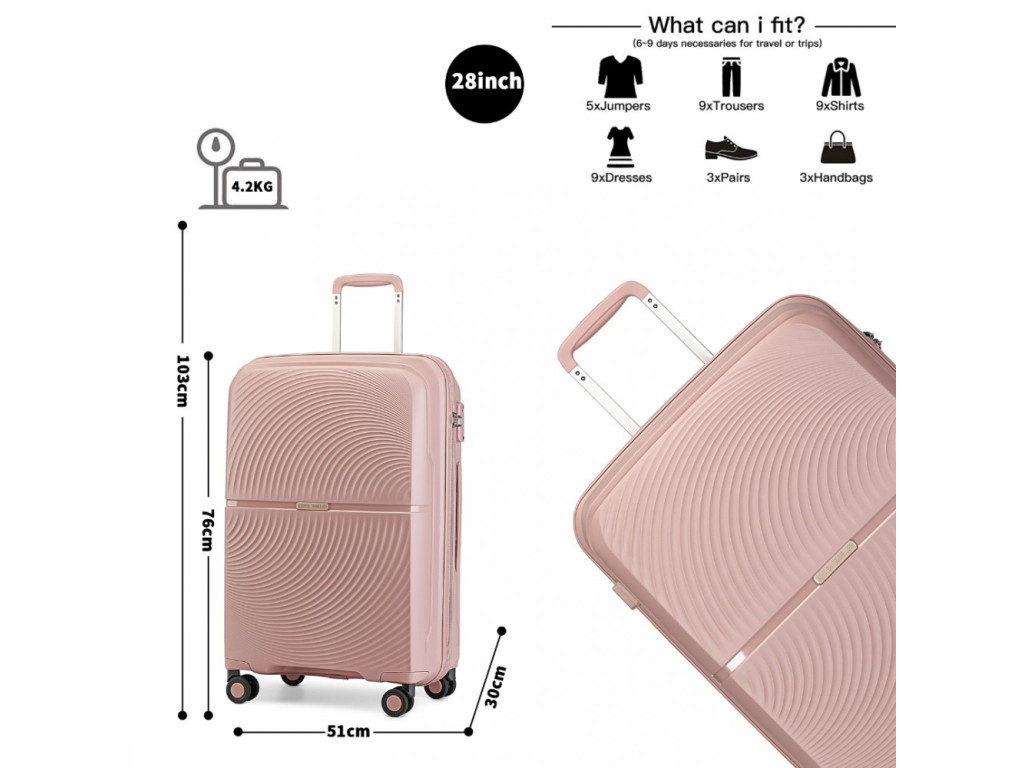 Kufr je vyroben z kvalitního polypropylenu s tichými dvojitými kolečky, hliníkovou výsuvnou rukojetí, TSA číselným zámkem a kvalitními zipy. Madlo kufru na horní i boční straně. Zejména u kabinového kufru většina výrobců madlo na podélné straně nenabízí.