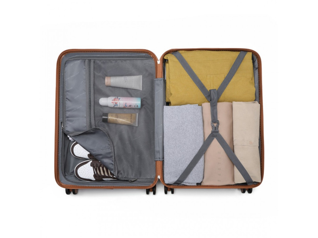 - Nylonové křížové popruhy pro upevnění obsahu na jedné straně a zipem zavíraná přihrádka na druhé straně kufru