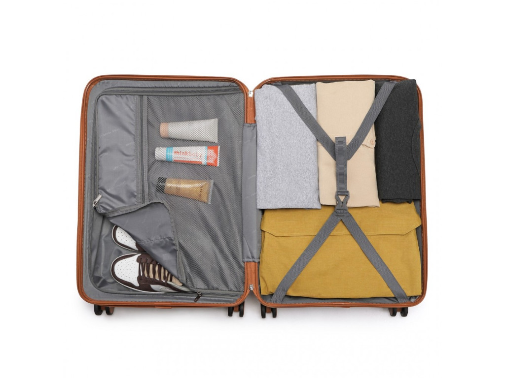- Nylonové křížové popruhy pro upevnění obsahu na jedné straně a zipem zavíraná přihrádka na druhé straně kufru