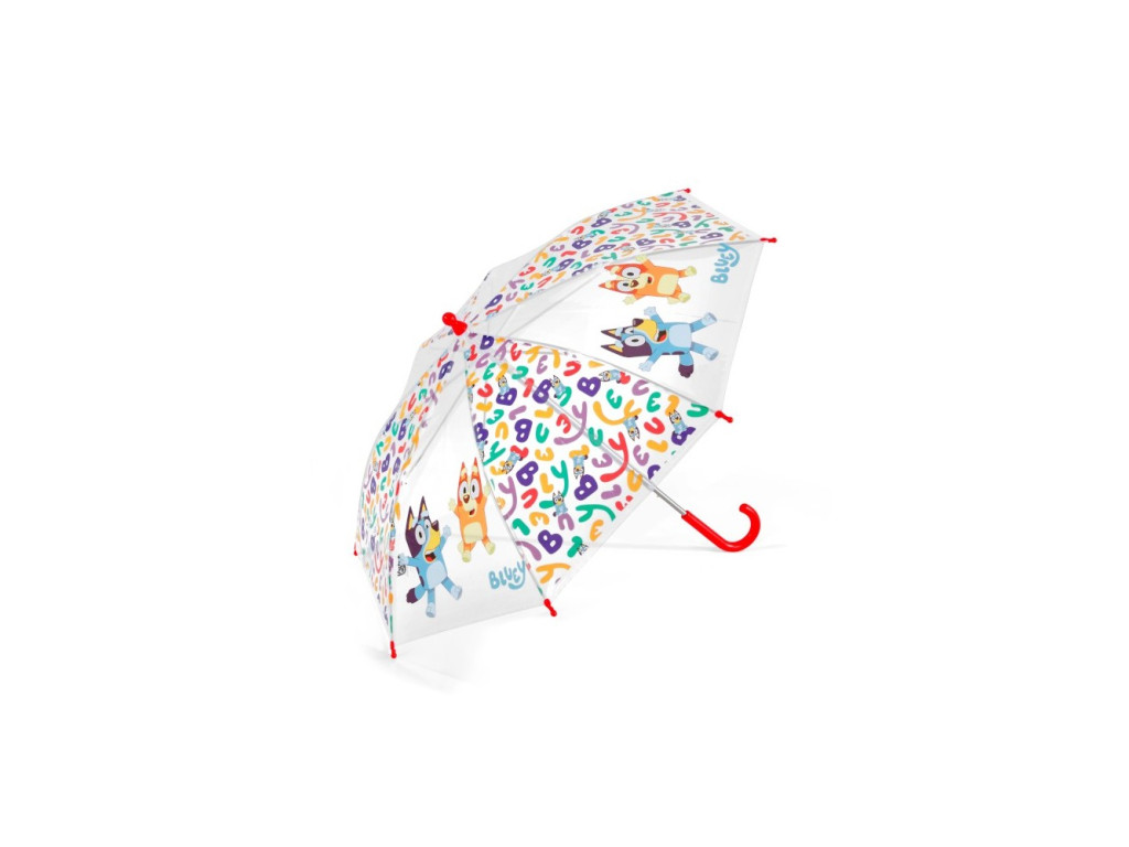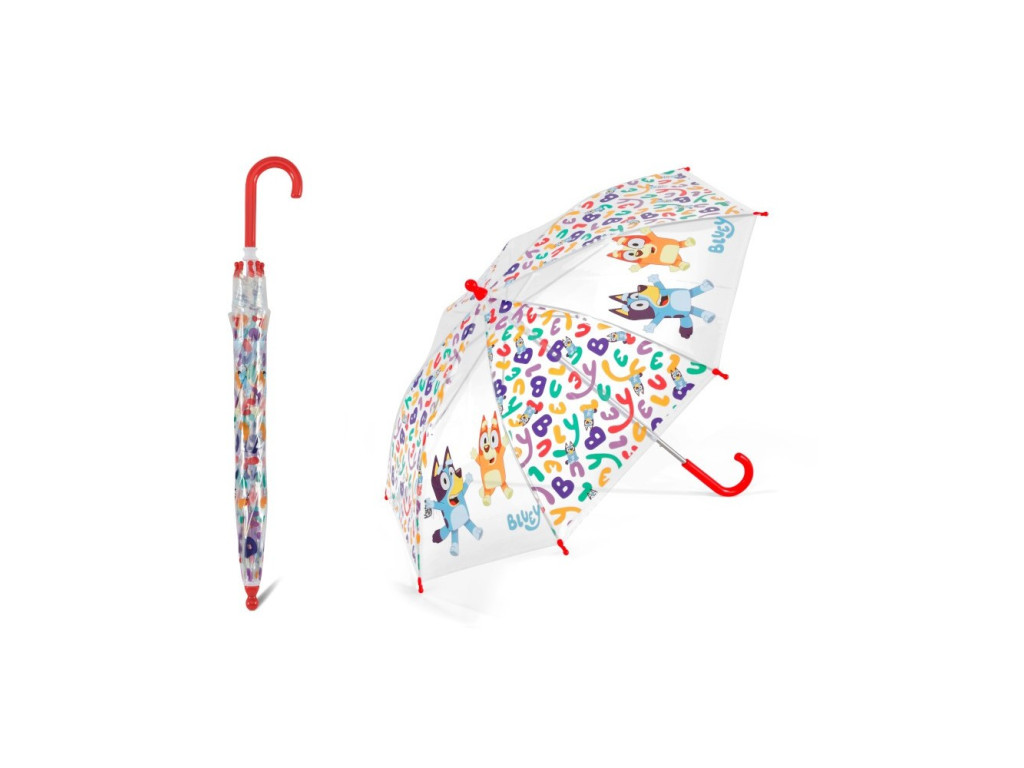 Průhledný deštník je ideální pro ty nejmenší (předškoláky) – má zakulacené koncovky pro maximální bezpečnost a díky pevné ocelové tyči a sklolaminátovým pružinám je odolný i vůči silnějšímu větru. Manuální otevírání zvládnou i děti a barevný potisk s Bluey a Bingo rozzáří i ten nejdeštivější den.