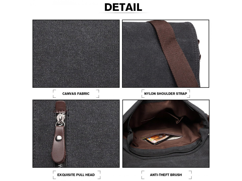 Stylová a praktická taška přes rameno s retro vzhledem a moderní funkčností. Vyrobena z odolného canvasu (pevná bavlněná tkanina, která snese každodenní nošení) s PU koženými detaily a kovovými doplňky.