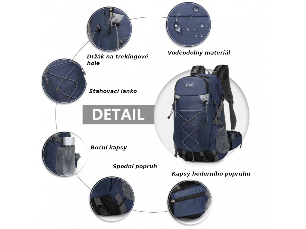Outdoorový batoh značky KONO. Kono nabízí kvalitní zavazadla a batohy za dostupné ceny. Tato značka je velmi známá v Západní Evropě pro optimální kombinaci ceny a výkonu. Od svého vzniku se zaměřuje na segment střední třídy.
