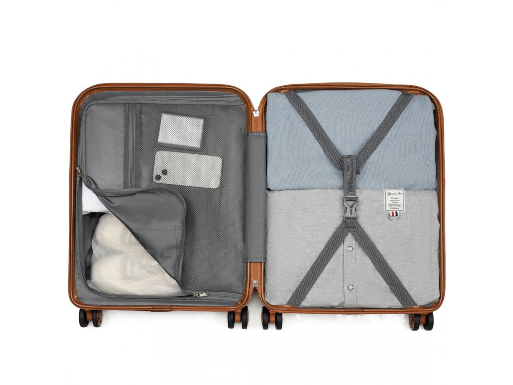 - Pružné křížové popruhy pro upevnění obsahu na jedné straně a zipem zavíraná přihrádka na druhé straně kufru
