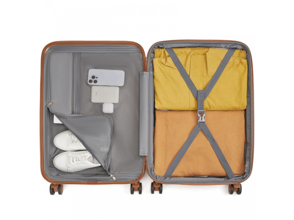 - Pružné křížové popruhy pro upevnění obsahu na jedné straně a zipem zavíraná přihrádka na druhé straně kufru