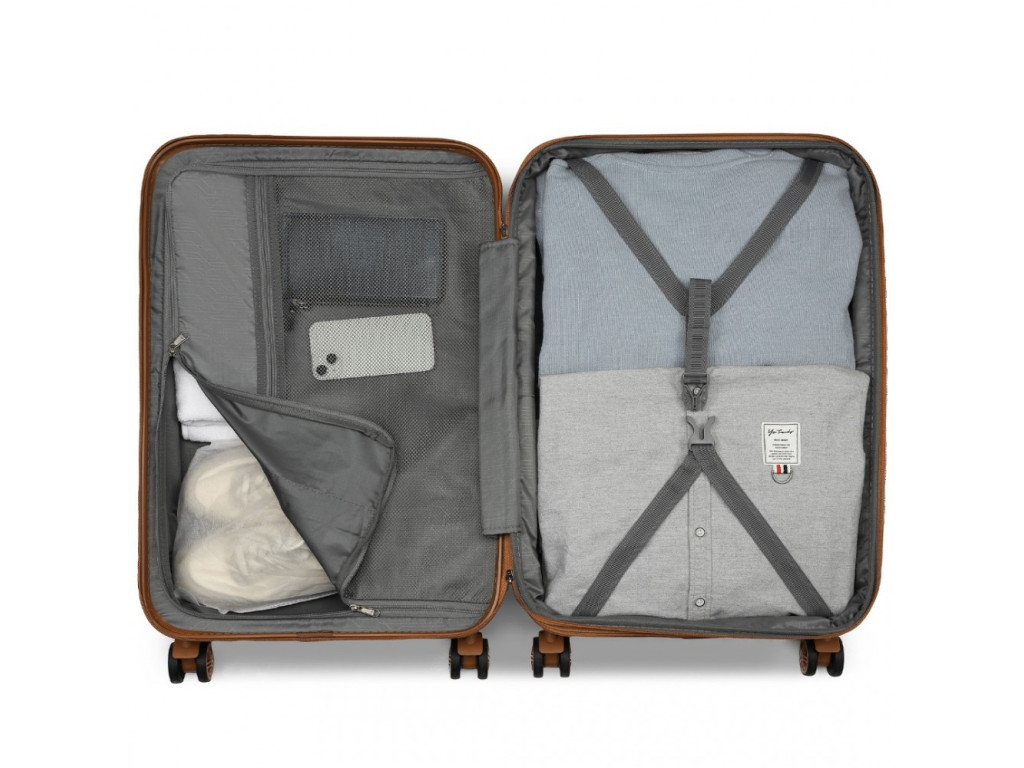 - Křížové popruhy pro upevnění obsahu na jedné straně a zipem zavíraná přihrádka na druhé straně kufru