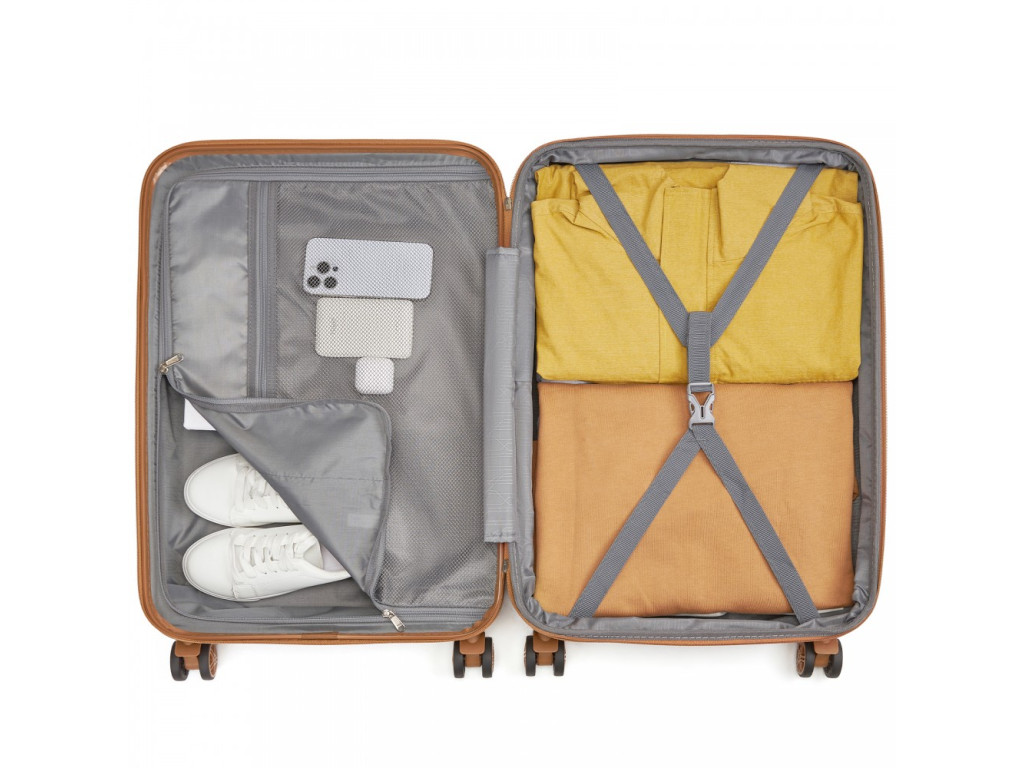 - Křížové popruhy pro upevnění obsahu na jedné straně a zipem zavíraná přihrádka na druhé straně kufru