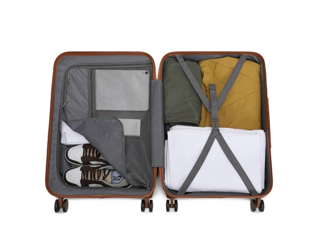 - Pružné křížové popruhy pro upevnění obsahu na jedné straně a zipem zavíraná přihrádka na druhé straně kufru