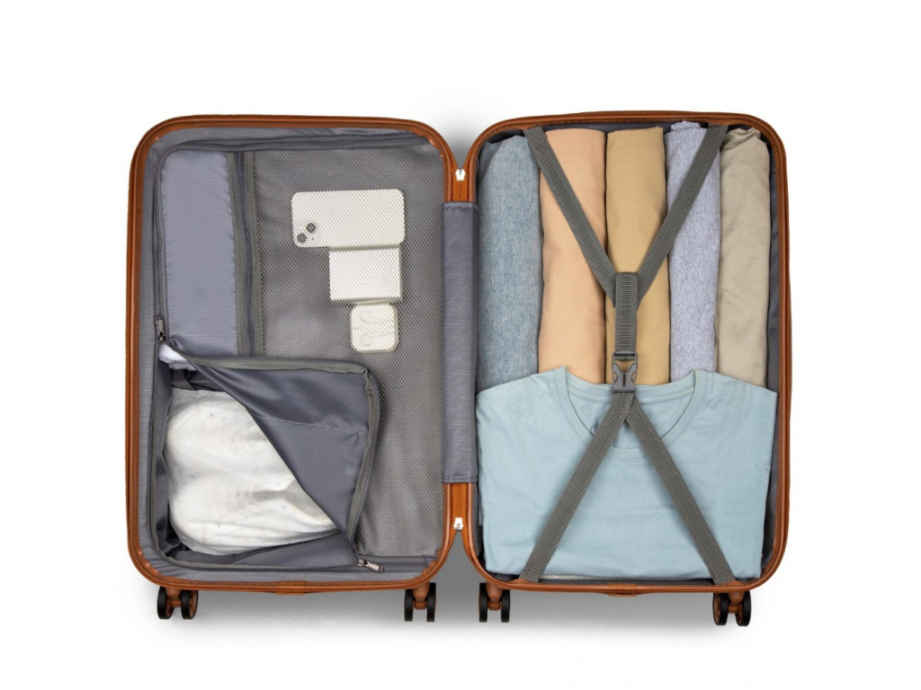 - Pružné křížové popruhy pro upevnění obsahu na jedné straně a zipem zavíraná přihrádka na druhé straně kufru