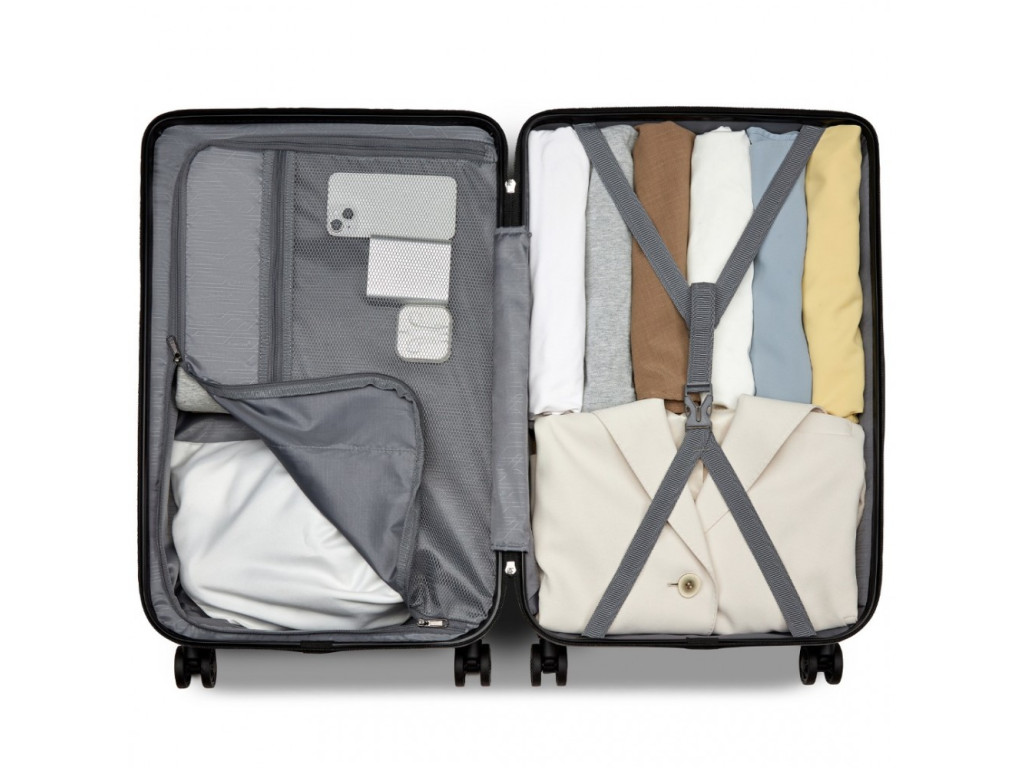 - Pružné křížové popruhy pro upevnění obsahu na jedné straně a zipem zavíraná přihrádka na druhé straně kufru