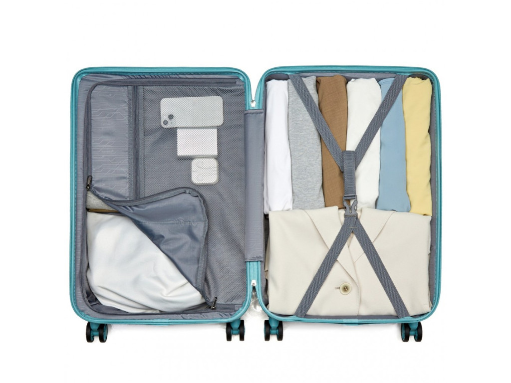 - Pružné křížové popruhy pro upevnění obsahu na jedné straně a zipem zavíraná přihrádka na druhé straně kufru