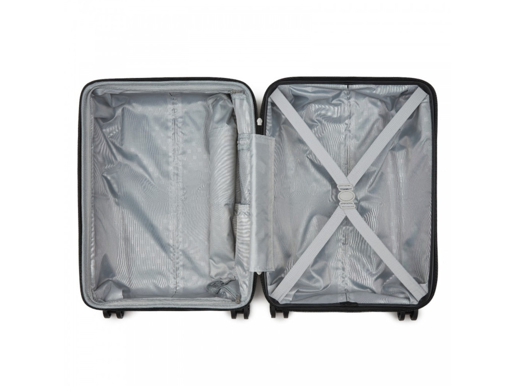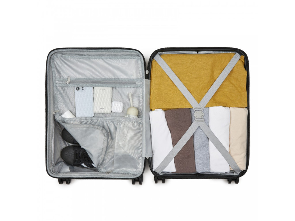 - Nylonové křížové popruhy pro upevnění obsahu na jedné straně a zipem zavíraná přihrádka na druhé straně kufru
