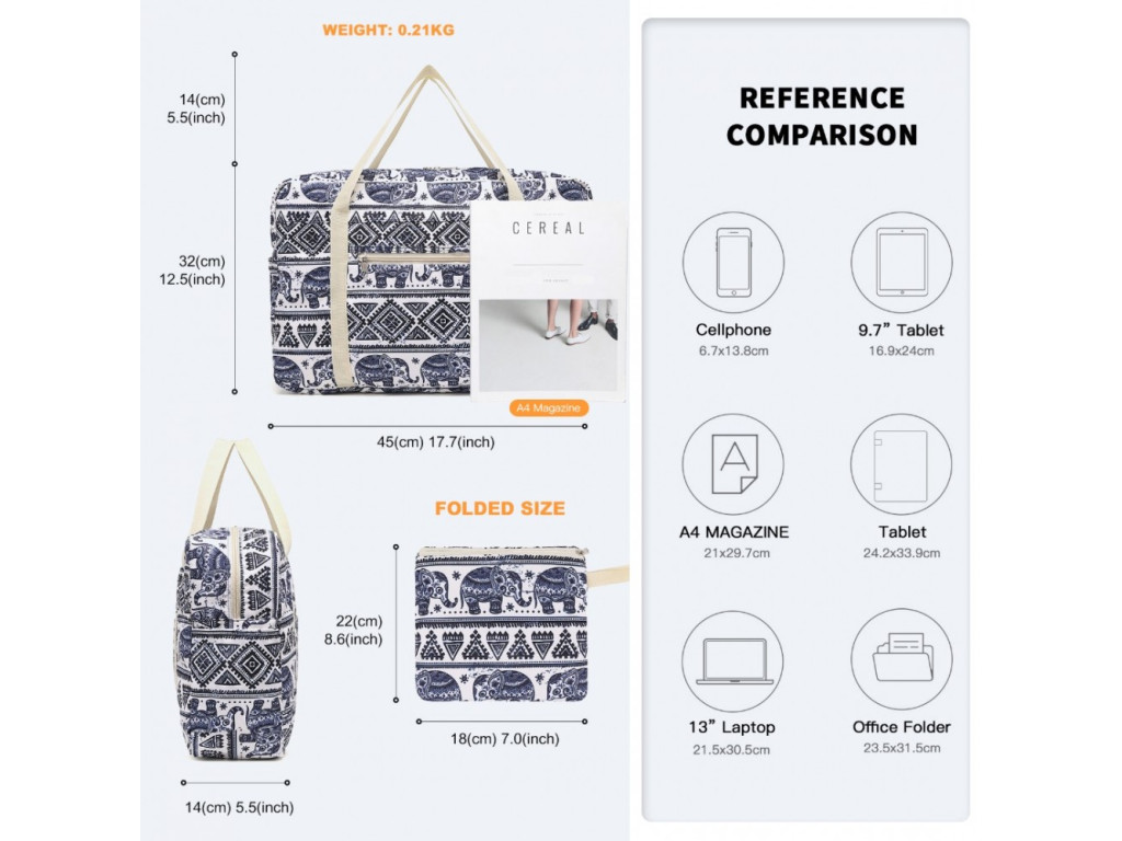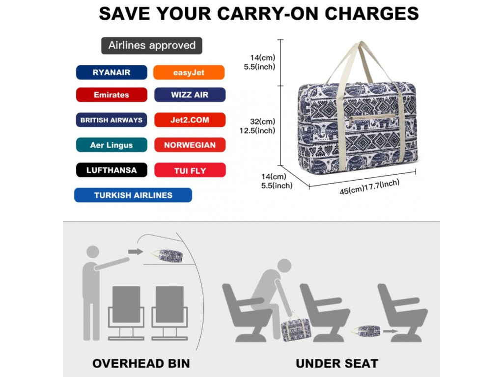 Kono EQ2308 je lehká a skládací cestovní taška do kabiny, navržená pro cestující, kteří hledají praktické řešení pod sedadlo v letadle. Vyrobena z kvalitního voděodolného bavlněného materiálu s polyesterovou podšívkou. Taška je pohodlná, skladná a ideální jako doplňkové zavazadlo nebo jako samostatný praktický kufřík.