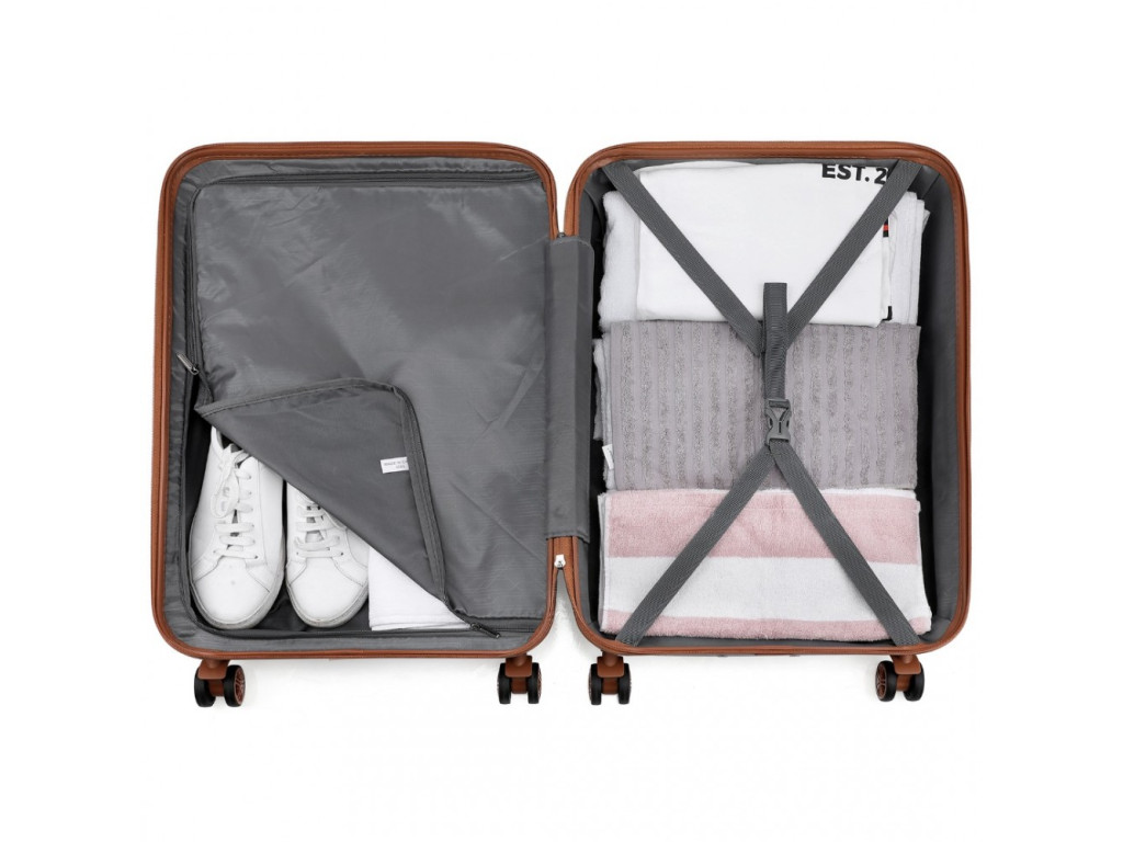 - Nylonové křížové popruhy pro upevnění obsahu na jedné straně a zipem zavíraná přihrádka na druhé straně kufru
