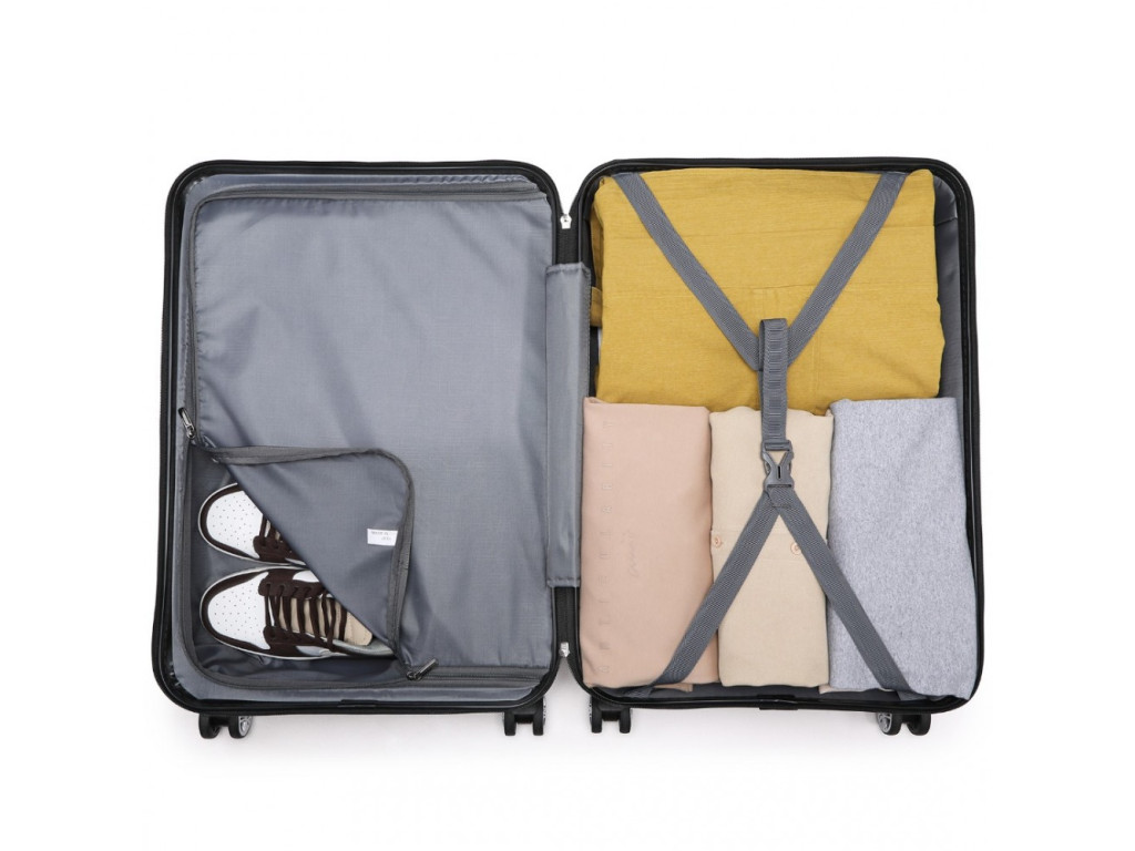 - Nylonové křížové popruhy pro upevnění obsahu na jedné straně a zipem zavíraná přihrádka na druhé straně kufru