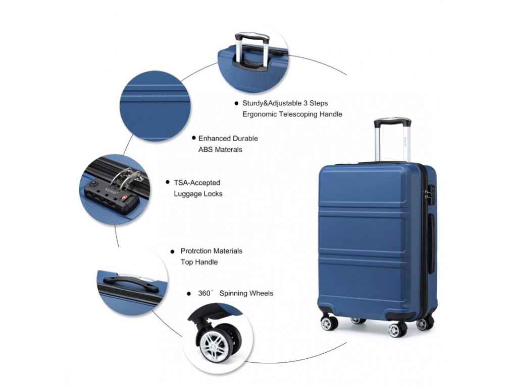 Kufry jsou vyrobeny z materiálu ABS s hliníkovou výsuvnou rukojetí a TSA číselným zámkem. ABS materiál je pevný, nabízí odolnost proti poškrábání a je vhodný do nízkých teplot. Tento materiál není tolik pružný jako polypropylen ale pro nenáročné cesty je plně dostačující.