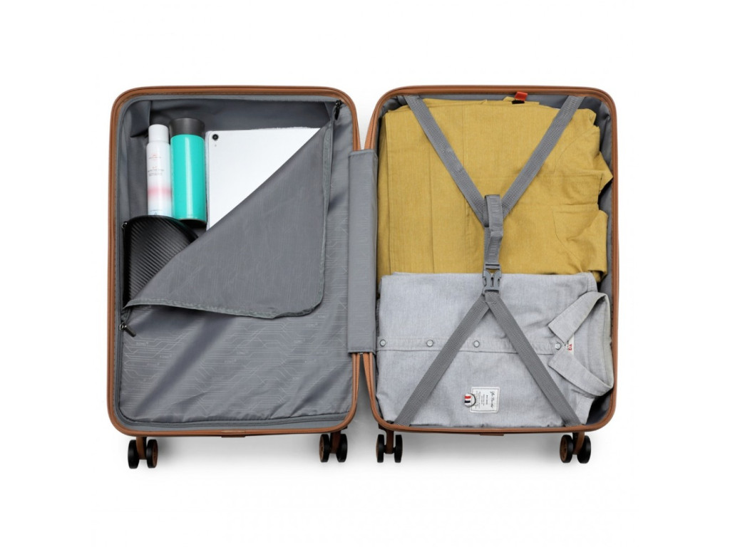 - Křížové popruhy pro upevnění obsahu na jedné straně a zipem zavíraná přihrádka na druhé straně kufru