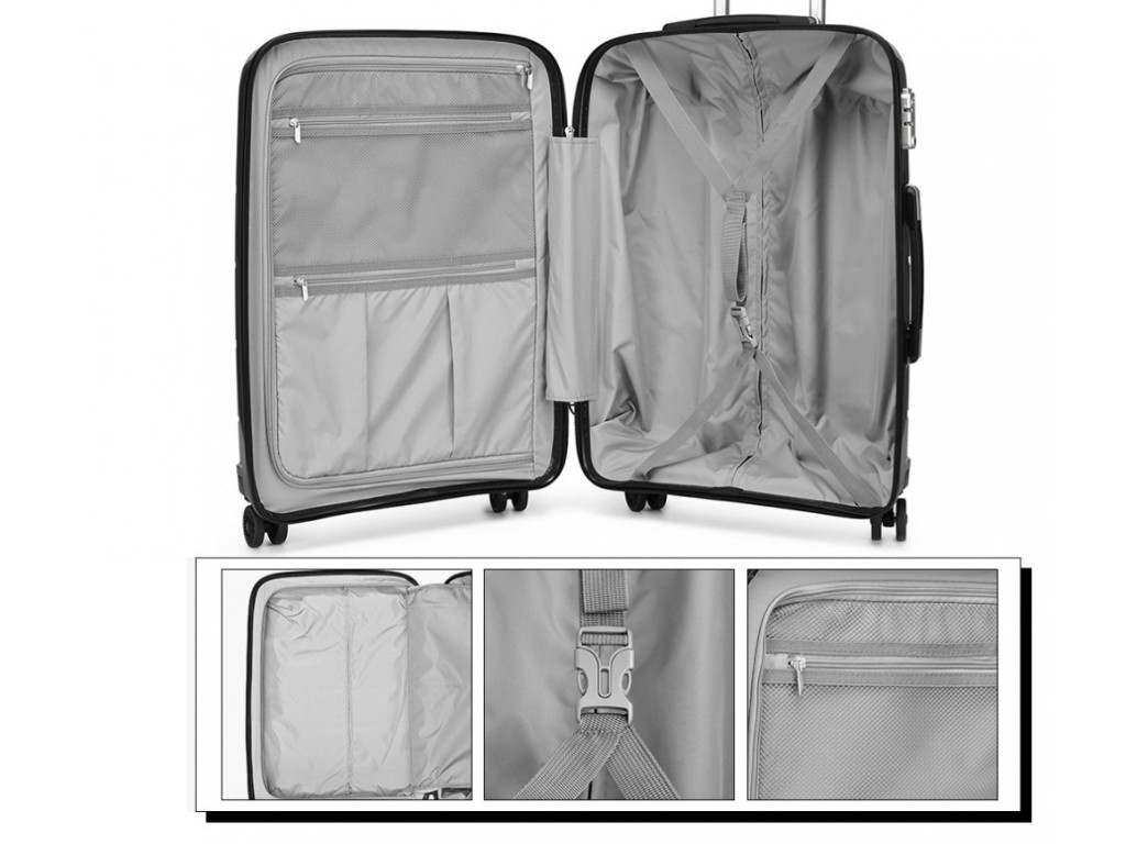 - Nylonové křížové popruhy pro upevnění obsahu na jedné straně a zipem zavíraná přihrádka na druhé straně kufru