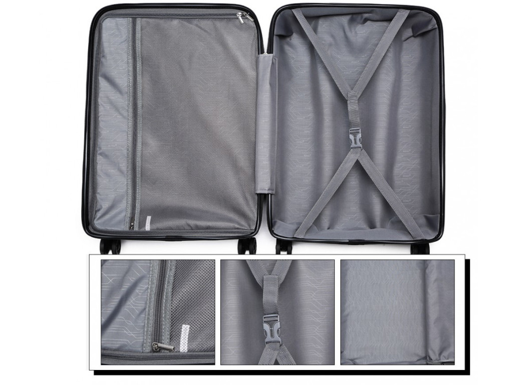 - Nylonové křížové popruhy pro upevnění obsahu na jedné straně a zipem zavíraná přihrádka na druhé straně kufru