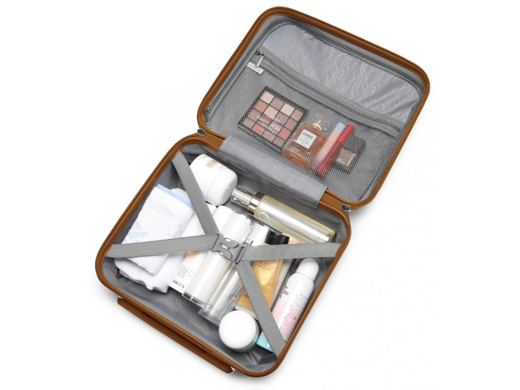 - Nylonové křížové popruhy pro upevnění obsahu na jedné straně a zipem zavíraná přihrádka na druhé straně kufru