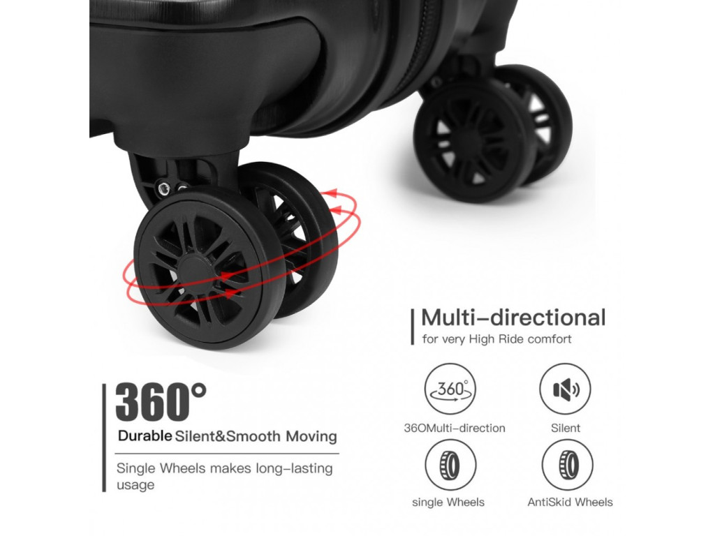 Vyroben z ABS s tichými dvojitými kolečky, hliníkovou výsuvnou rukojetí nebo TSA číselným zámkem. ABS materiál nabízí odolnost proti poškrábání a je vhodný do nízkých teplot. ABS materiál není tolik pružný jako polypropylen ale pro občasné cesty je plně dostačující.