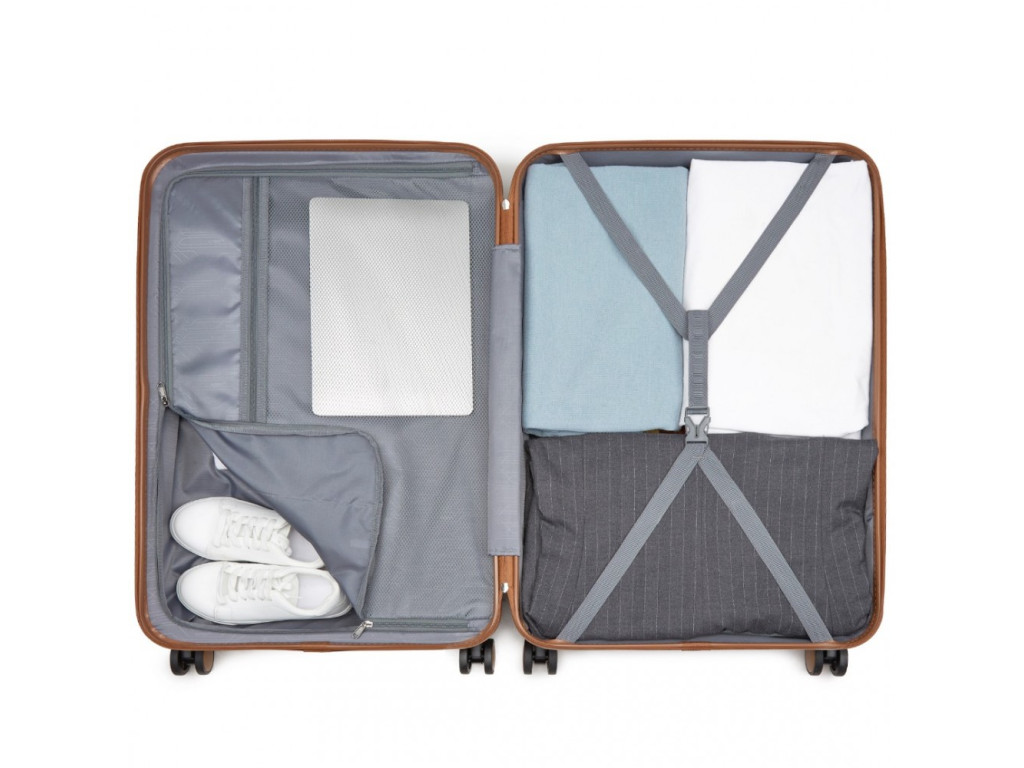 - Nylonové křížové popruhy pro upevnění obsahu na jedné straně a zipem zavíraná přihrádka na druhé straně kufru