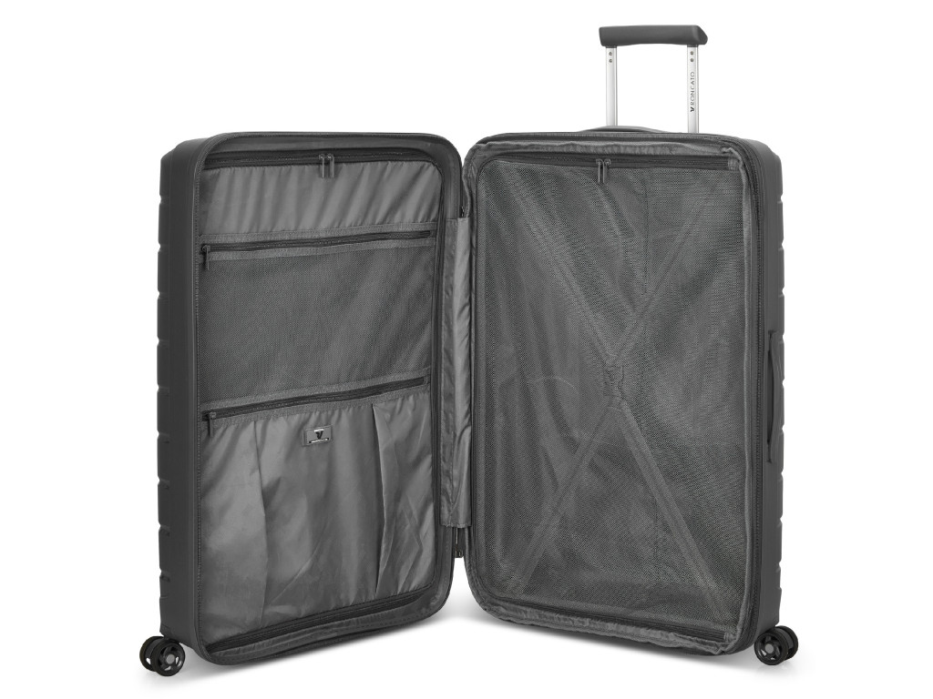 Uvnitř kufru Roncato B-Flying najdete promyšleně rozvržené prostory, disponující dvěma velkými přihrádkami na zip, které vám umožní oddělit různé typy oblečení či osobní předměty.