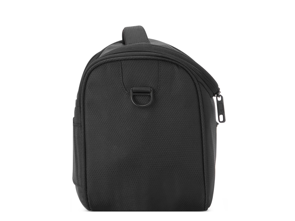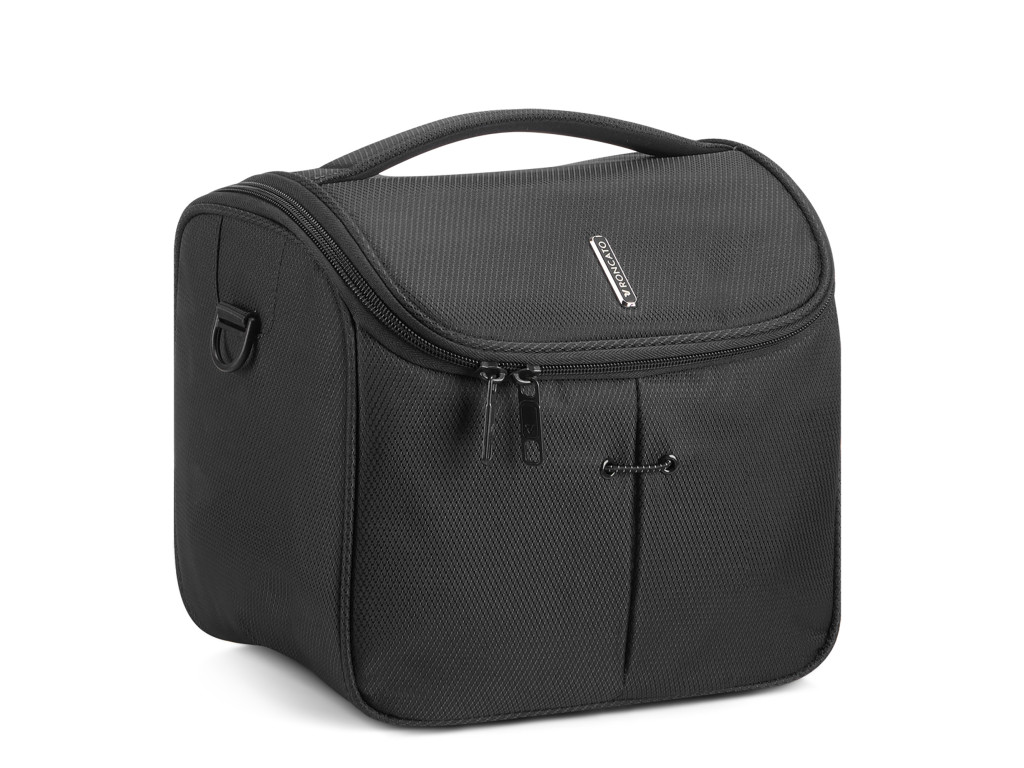Kosmetická taška má horní úchop a popruh přes rameno. Otevírá se pomocí zipu a na zadní straně má pásek pro uchycení na vysunovací madlo kufru, takže ji můžete lehce zavěsit na váš kufr.