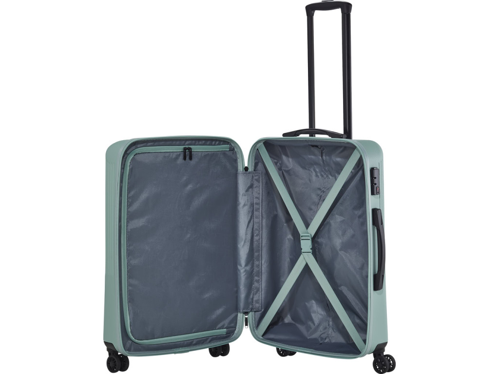 Jednoduše navržený interiér s látkovou příčkou a popruhy pomůže rychle a přehledně sbalit vše potřebné na delší cesty i kratší pobyt mimo domov. Skořepina z odolného tvrdého plastu s hrubým povrchem a integrovaný zámek ochrání uložené věci během přepravy. Čtyři kolečka usnadní jízdu v terénu i manipulaci s plně naloženým zavazadlem.