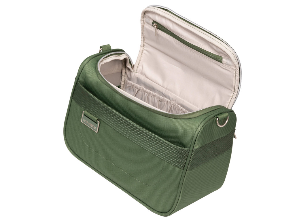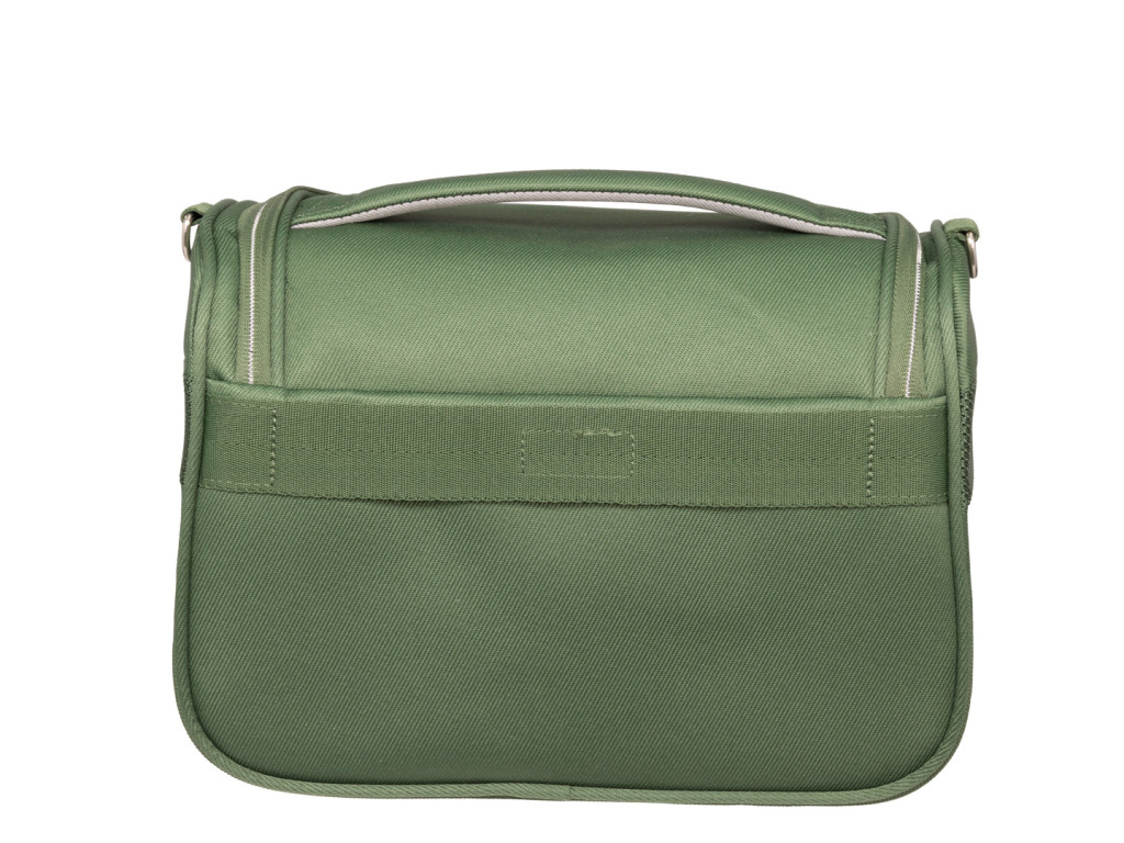 Nadčasový a elegantní textilní kosmetický kufřík s odnímatelným popruhem přes rameno vyrobený z recyklovaného polyesteru.