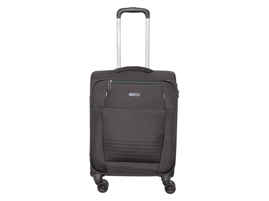 Odlehčený textilní cestovní kufr z odolného polyesteru na čtyřech kolečkách vybavený integrovaným kombinačním zámkem.