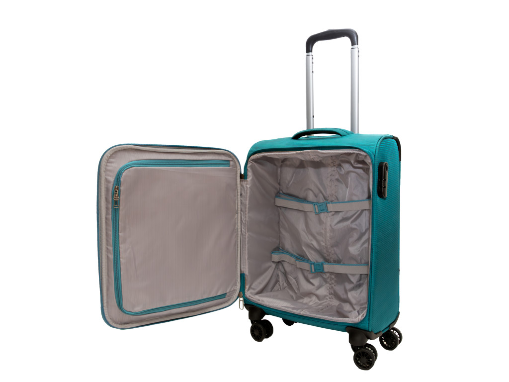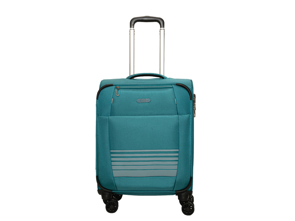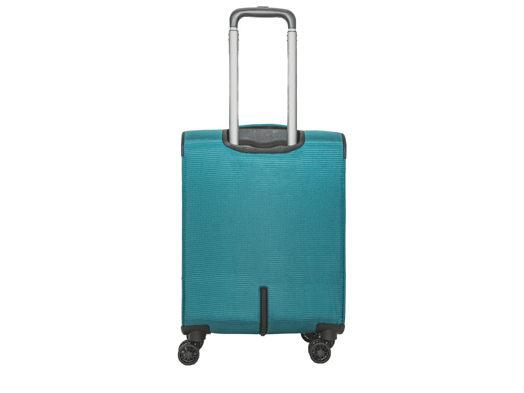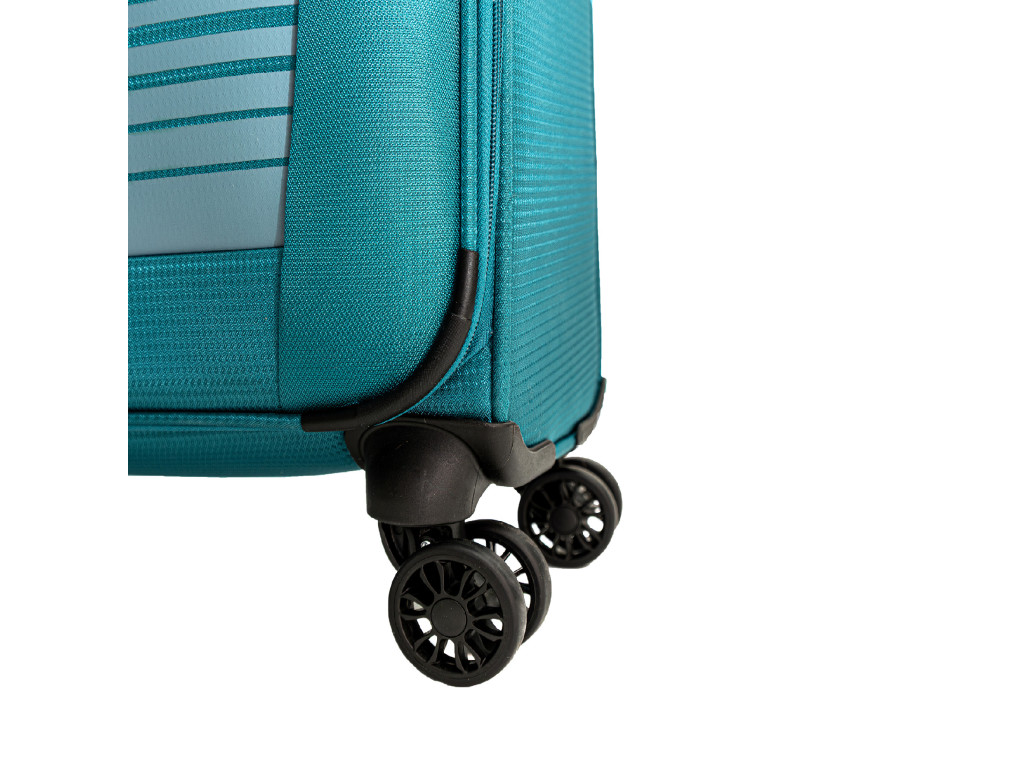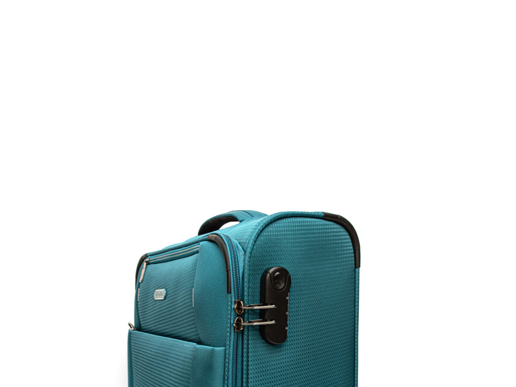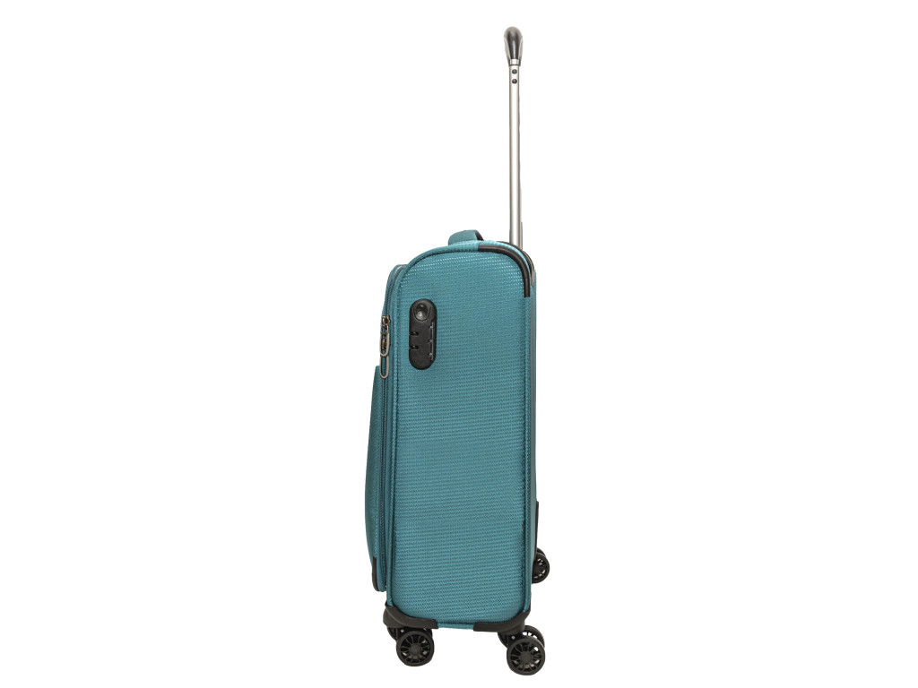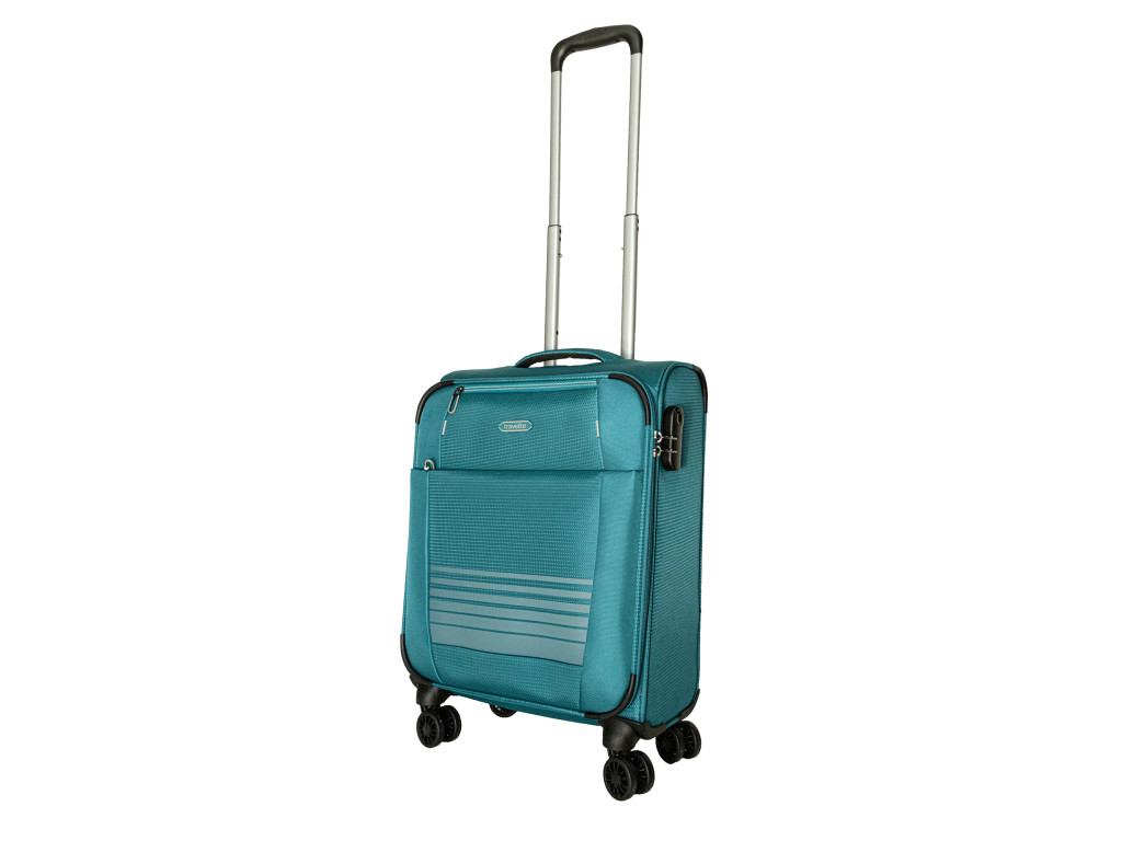Odlehčený textilní cestovní kufr z odolného polyesteru na čtyřech kolečkách vybavený integrovaným kombinačním zámkem.