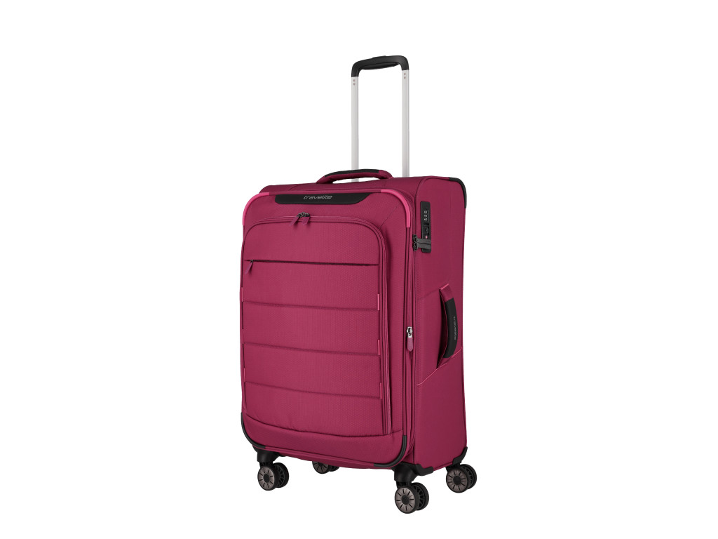 Extra lehký textilní kufr na čtyřech kolečkách s integrovaným TSA zámkem a expandérem vyrobený z recyklovaného polyesteru.