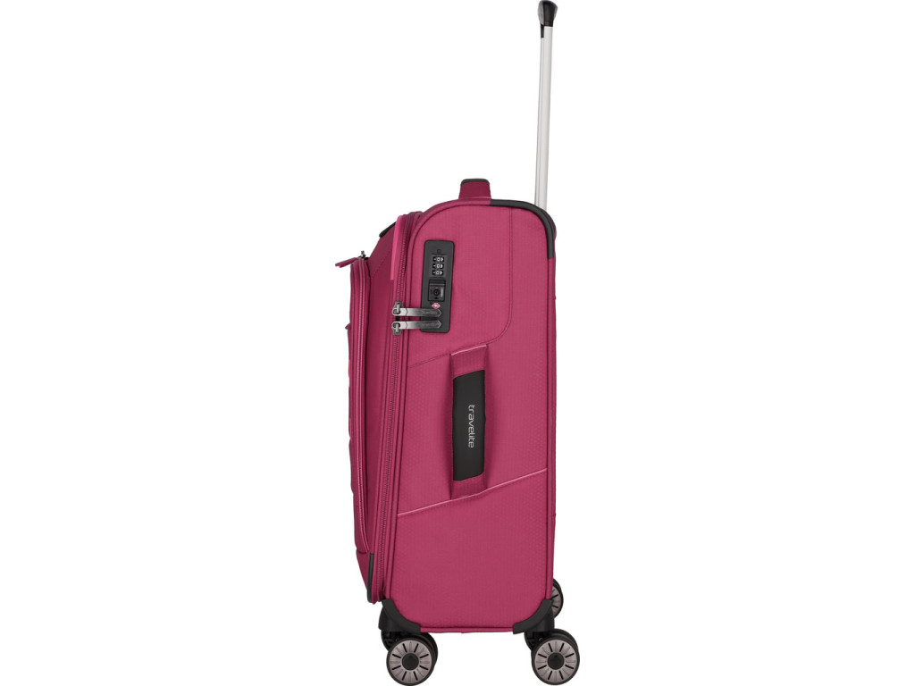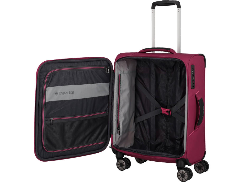 Extra lehký textilní palubní kufr na čtyřech kolečkách s integrovaným TSA zámkem vyrobený z recyklovaného polyesteru.