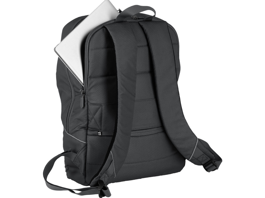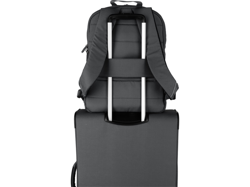 Extra lehký městský batoh z recyklovaného polyesteru s kapsou na 15,6" notebook a popruhem pro nasunutí na madlo kufru vhodný na cesty do práce i volný čas.