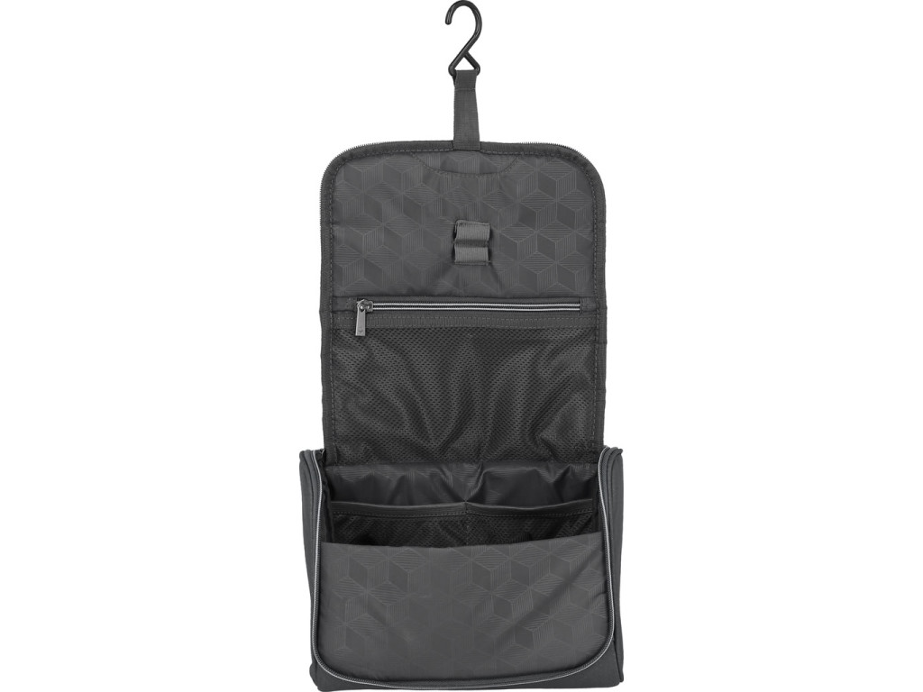 Extra lehká a prostorná kosmetická taška s háčkem na zavěšení a praktickým vnitřním členěním vyrobená z recyklovaného polyesteru.