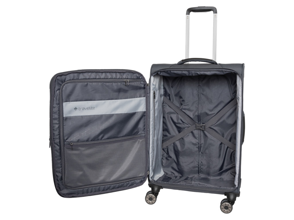 Superlehký a prostorný kufr Travelite Skaii z udržitelného materiálu se postará o váš bezstarostný život na cestách i čistější životní prostředí. Recyklovaný polyester vyrobený z vláken recyklovaných plastových lahví (rPET) pomáhá šetřit suroviny a snižovat množství plastového odpadu. Díky promyšlenému funkčnímu interiéru s fixačními popruhy, oddílem na košile a dvěma kapsami na zip budete mít vždy dokonalý přehled o tom, co jste si kam sbalili. Přední kapsy pojmou cestovní doklady, mobil, nabíječku a další nezbytnosti, které si chcete nechat při ruce. TSA zámek usnadní kontrolu obsahu zavazadla při cestování mezi kontinenty. Kvalitní otočná kolečka, úchyt na dně, dvě pevná madla a odlehčená rukojeť zajistí pohodlnou manipulaci. Kufr je navíc vybaven expandérem pro navýšení objemu.