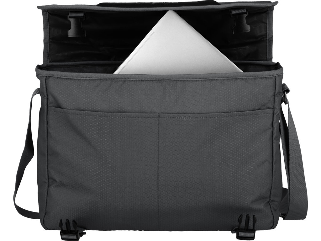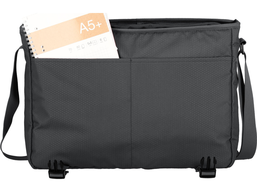 Extra lehká taška přes rameno s klopou na přezky, přihrádkou na 15,6" notebook a odnímatelným popruhem vyrobená z recyklovaného polyesteru.