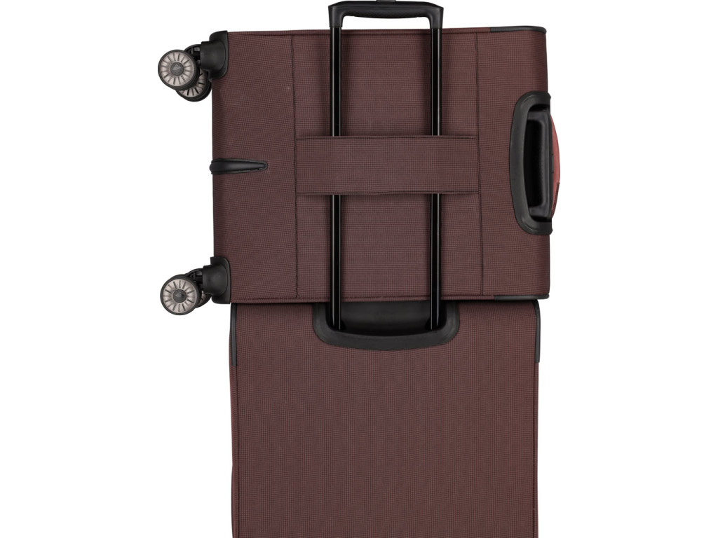 Textilní kufr na čtyřech kolečkách s integrovaným TSA zámkem vyrobený z recyklovaného polyesteru.