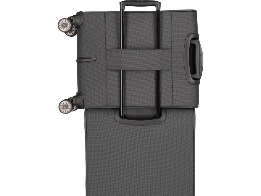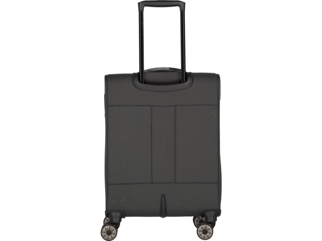 Textilní kufr na čtyřech kolečkách s integrovaným TSA zámkem vyrobený z recyklovaného polyesteru.