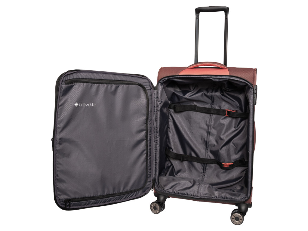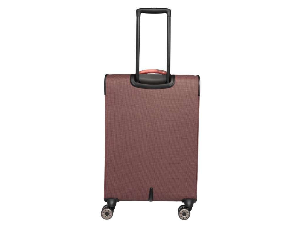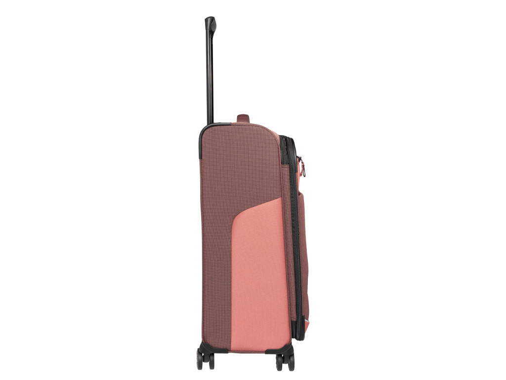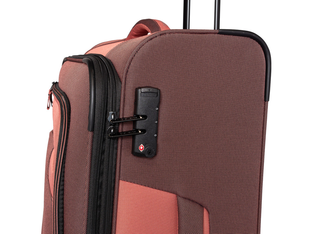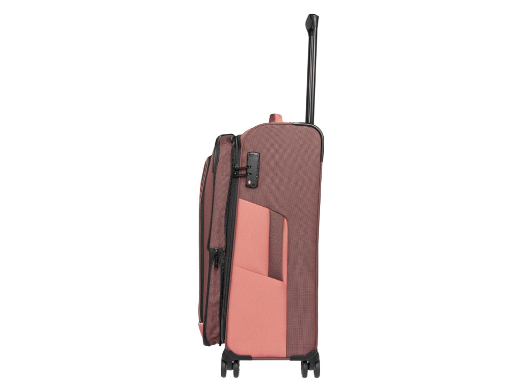 Textilní kufr na čtyřech kolečkách s integrovaným TSA zámkem a expandérem vyrobený z recyklovaného polyesteru.
