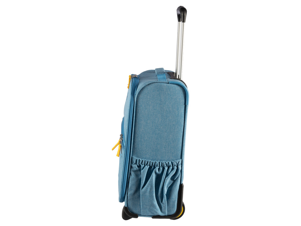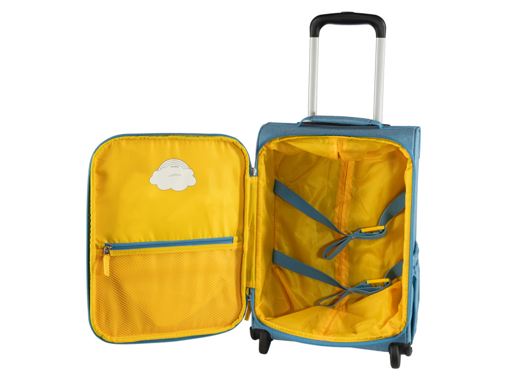 Textilní kufr se dvěma kolečky určený pro mladé cestovatele. Kufr má lehkou výsuvnou rukojeť s ergonomickým úchopem pro pohodlné ovládání, velkou přední kapsu na zip, která je ideální pro uložení oblíbené hračky, časopisu nebo omalovánek. Dále je vybaven polstrovaným uchem pro snadné zvedání, boční kapsou s pružným lemem vhodnou pro umístění láhve nebo deštníku a kontrastní podšívkou s integrovanou jmenovkou pro personalizaci.